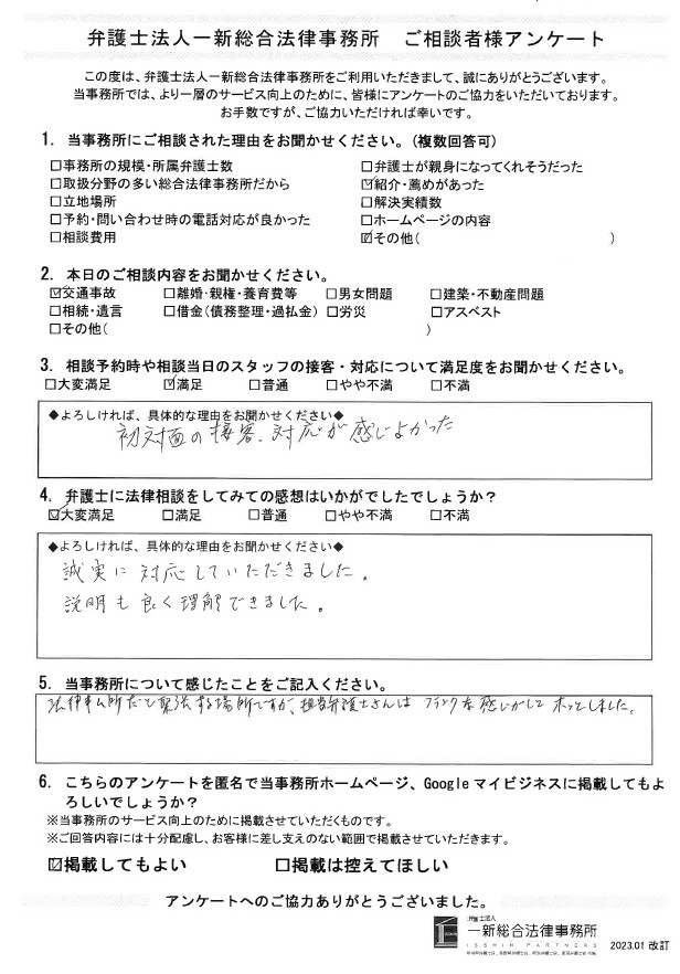 「交通事故」についてお悩みの方、弁護士をお探しのみなさまは、一新総合法律事務所までどうぞお気軽にお問い合わせください。